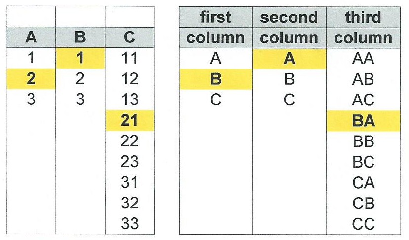 Let’s use the first set of columns for an example. In column A there is a 1 in 3 chance that the number chosen will be 2. In column B there is a 1 in 3 chance that the number will be 1. However if you put both A and B together it will not be 1 in 6 chance for 21, (3+3) instead it will be 1 in 9 (3×3) chance as seen in column C. You can see by looking at the second set of columns; working with letters is done the same way. So getting back the word ‘how‘. It will not be 55+55+55=165, instead it will be 55x55x55=166375.